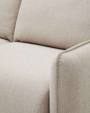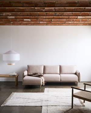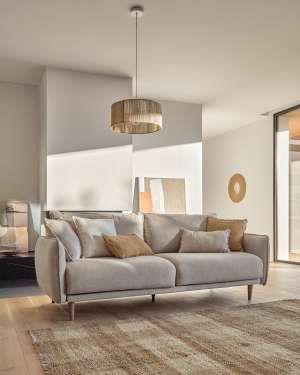 Carlota has a rounded design, composed of an upholstered base, exposed legs in beech wood with walnut stain, armrests that reach the end of the seat and backrest with removable cushions, which give it extra comfort thanks to its filling of recycled siliconised PET fibres. It has a medium seat for a higher level of relaxation and a structure made from pine wood and MDF E0 board.